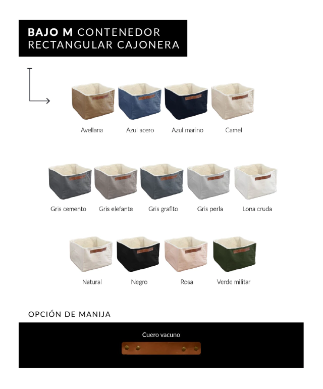 Recomendamos no utilizar el lavarropas como medio para limpiar nuestros contenedores, dado que si cuenta con manijas de cuero, al ser 100% vacunos, estas pueden desteñir la tela del producto; por otro lado, al colocarlo en lavarropas, el producto puede sufrir daño en su interior que arruinen el correcto funcionamiento del canasto contenedor de tela.