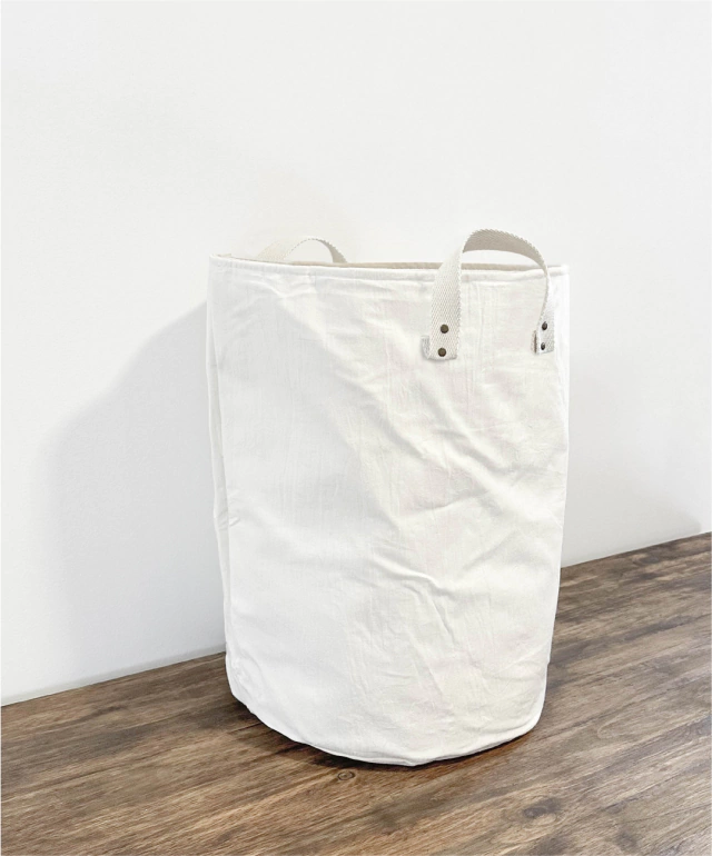 Contenedor redondo reforzado en costuras, base y con doble forro de tela; es resistente y logra mantener su forma estando vacío.